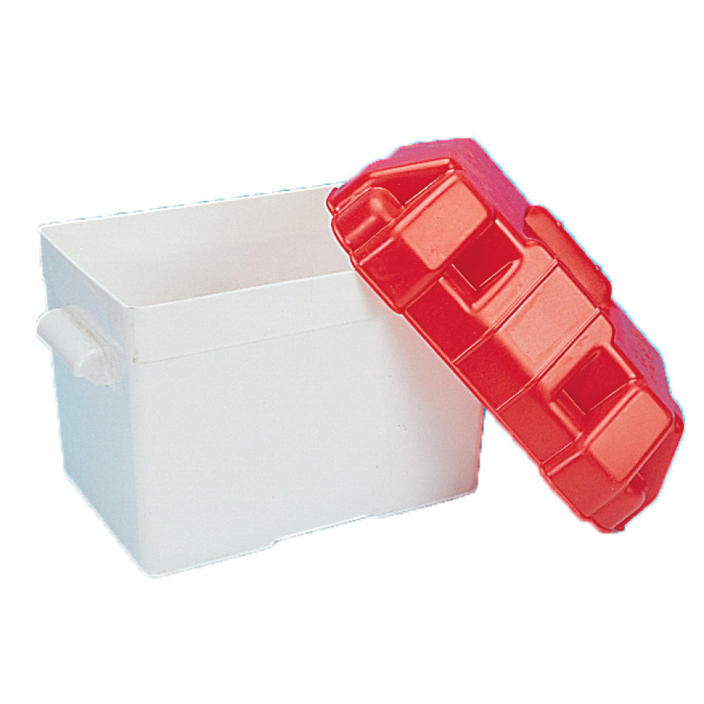 Accubak gemaakt van zuur- en petroleumbestendig kunststof met spatwaterdichte deksel. Wordt geleverd met een riem om af te sluiten en te vervoeren.