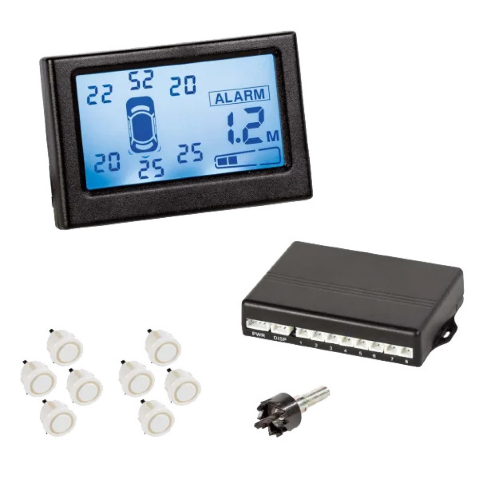 Parkeersensoren voor het achteruit inparkeren van uw camper. Geeft een hoorbaar alarm en een automatische stand-by. Heeft een detectie voor personen en hindernissen. Werkt op 12 en 24 Volt. LCD Scherm. 8 sensoren 20mm. Wordt geleverd met 19,5mtr kabel.