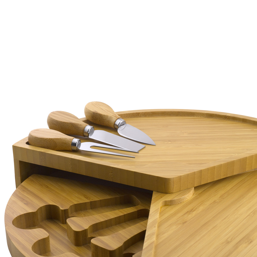 Deze ViaMondo borrelplank wordt geleverd inclusief 3 mesjes. Zo heb je altijd de mesjes binnen handbereik wanneer je ze nodig hebt. Handig voor kazen, worstjes of fruit. Hij is makkelijk in elkaar te draaien en is daardoor ruimtebesparend. De borrelplank is gemaakt van duurzaam bamboe en is eenvoudig te reinigen. Geniet van heerlijke hapjes en snijgemak met deze veelzijdige borrelplank.