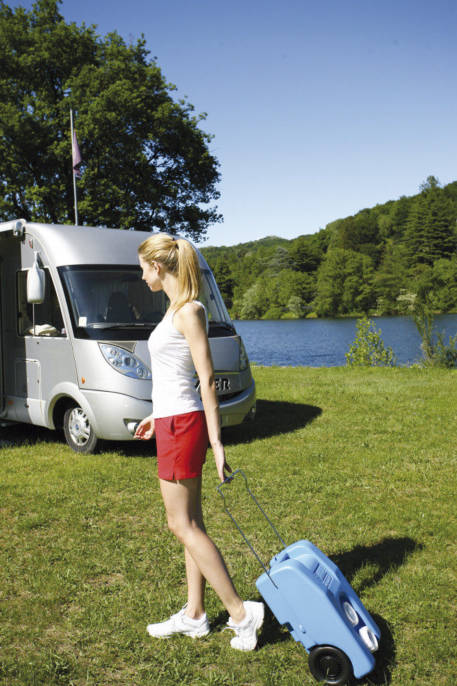 Handige en verrijdbare roll-tank met leegdop. Compacte afmetingen, past in alle standaard luikjes. Compleet met extra dop die is voorbereid voor gebruik met de dompelpomp. Voorzien van een uitklapbare handgreep. Kunststof wielen.