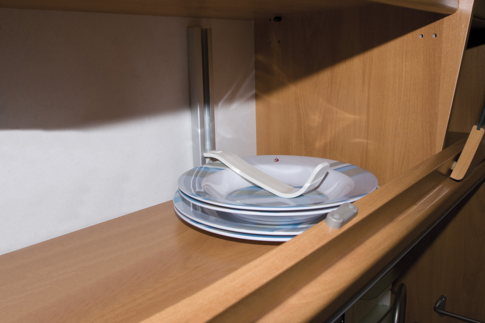 De ideale oplossing om uw serviesgoed tijdens het rijden op de juiste plek te houden. Bevestig de strip aan de zijkant in een kastje, zet de borden eronder schuif de beugel naar beneden en het staat vast.