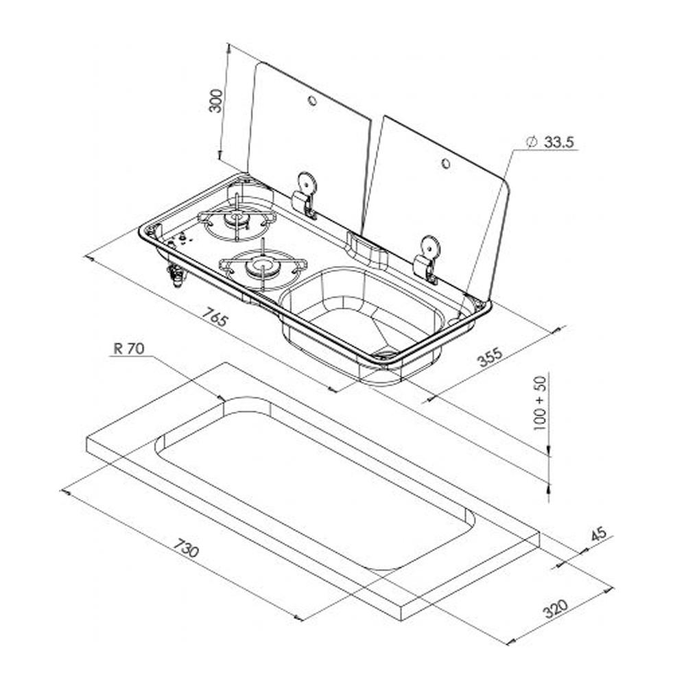Rechthoekige gaskookplaat–unit 2 pits met rechthoekige spoelbak compleet met gehard glazen deksel, met branders met zelf-blokkerend vlam deksel, s / s ingebouwde ondersteuning met anti–vibratie rubberringen en verzonken scharnier vast grid. Branders: alle branders uitgerust met thermokoppel (veiligheidsventiel). 2x* Half snelle: 1900 W–127 g / h * Breedte (mm) 738* Hoogte (mm) 51+100* Diepte (mm) 321