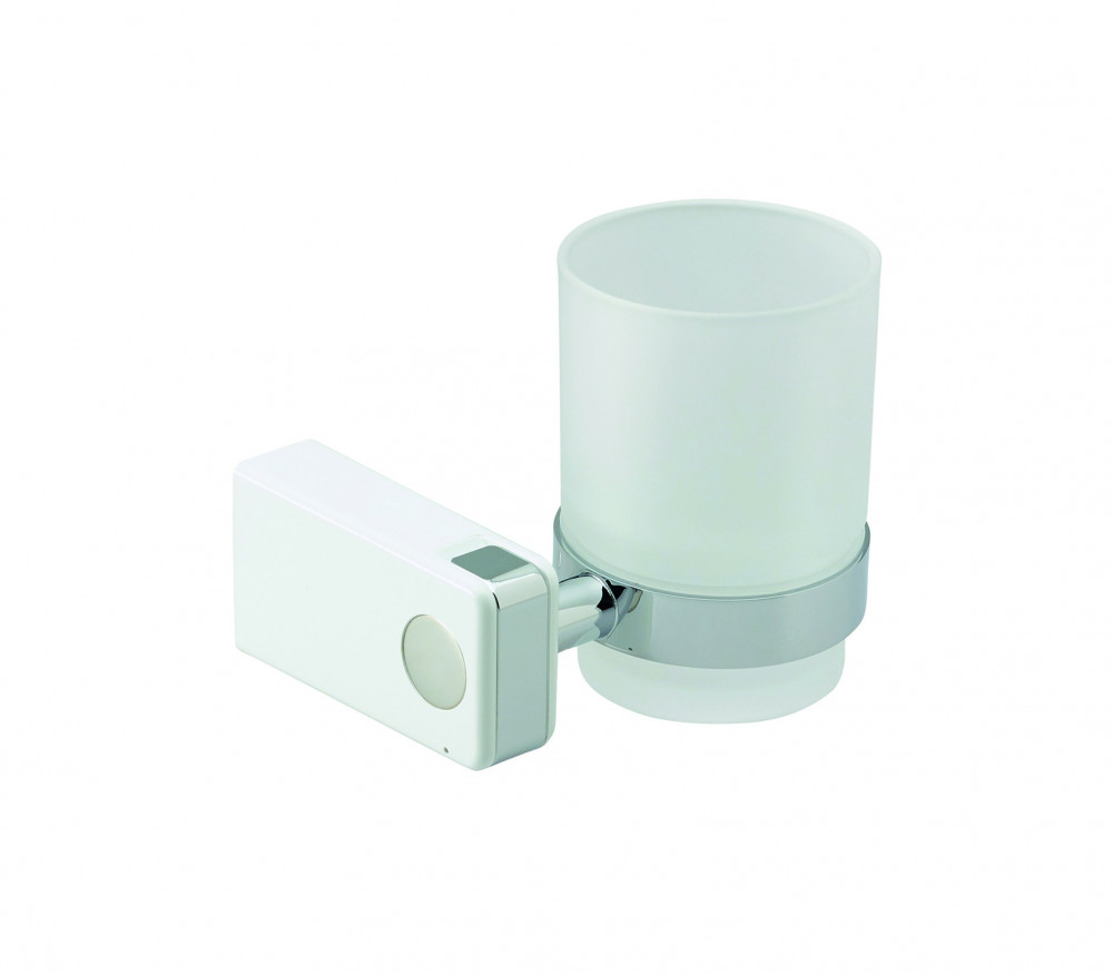 Wandhouder voorzien van glazen beker. Met witte houder voor aan de muur. Tevens zit er een uitklapbaar haakje aan de wandhouder.