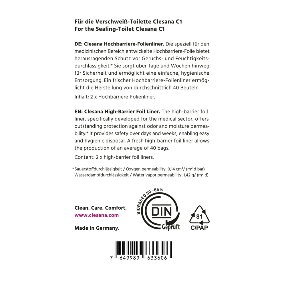 De DIN-gecertificeerde, biologische folie met hoge barrière is gemaakt van biomassa en gerecyclede materialen en biedt uitstekende bescherming tegen geur- en vochtdoorlatendheid. Dit garandeert dagen- en wekenlange veiligheid en maakt eenvoudige, hygiënische verwijdering mogelijk. Met één nieuwe Bio High Barrier folie kunnen gemiddeld 40 zakken worden geseald.Zuurstofdoorlaatbaarheid: 0,14 cm³/(m²d bar) Waterdampdoorlaatbaarheid: 1,42 g/(m²d)