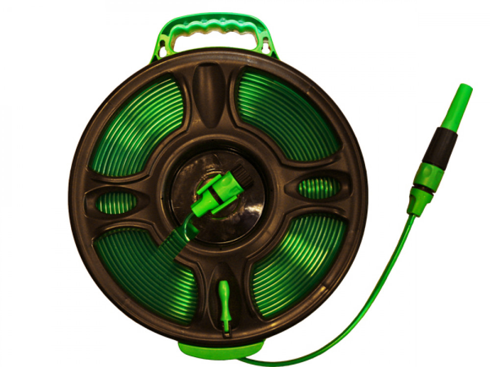 Waterslanghaspel van 15meter. Opgerold te gebruiken door de open slang structuur met regelbare spuitmond.