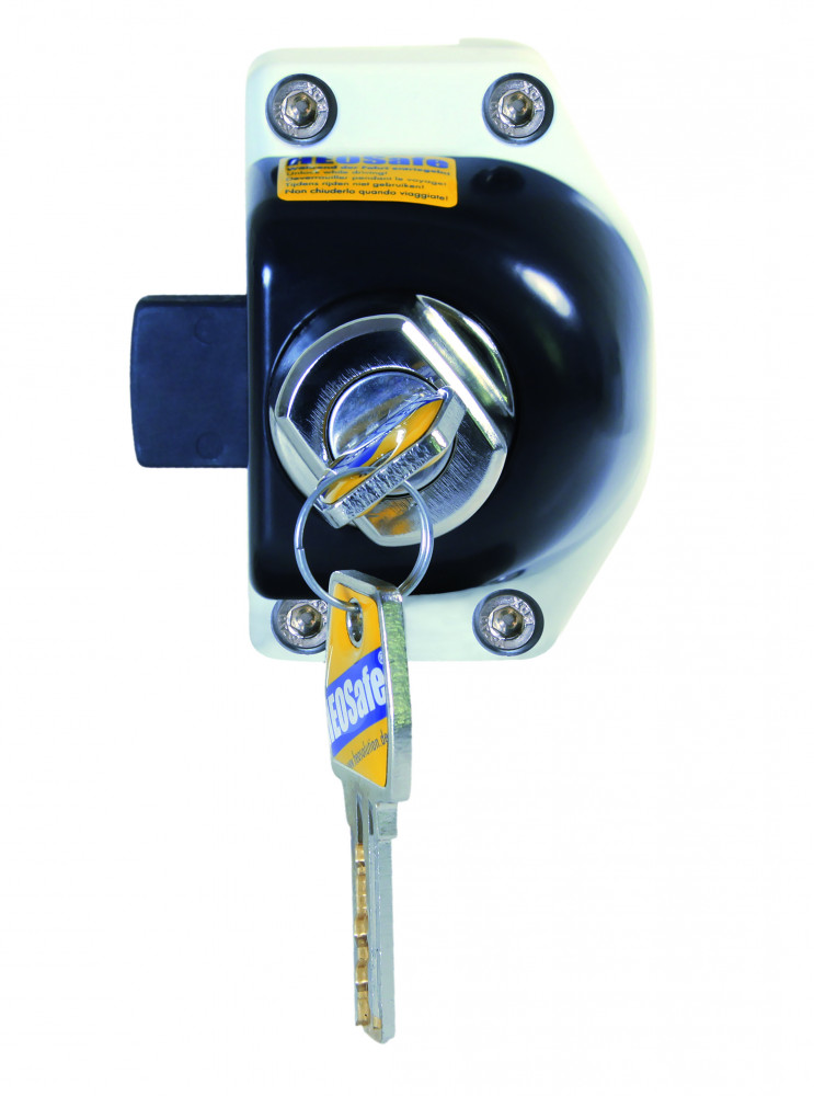 Sloten tegen diefstal voor de deuren van de cabine. Afsluitbaar, drukknop met afsluitbare cylinder. Is voor de Mercedes Sprinter en VW Crafter vanaf 2006. Met slot en sleutel. Door het indrukken en dan draaien van de drukknop wordt het sluitsysteem vergrendeld of ontgrendeld. De drukknop vergrendelt automatisch zodra de grendel volledig in- of uitgedraaid is. Maar de deur kan enkel door het draaien van de drukkknop geopend of gesloten worden.