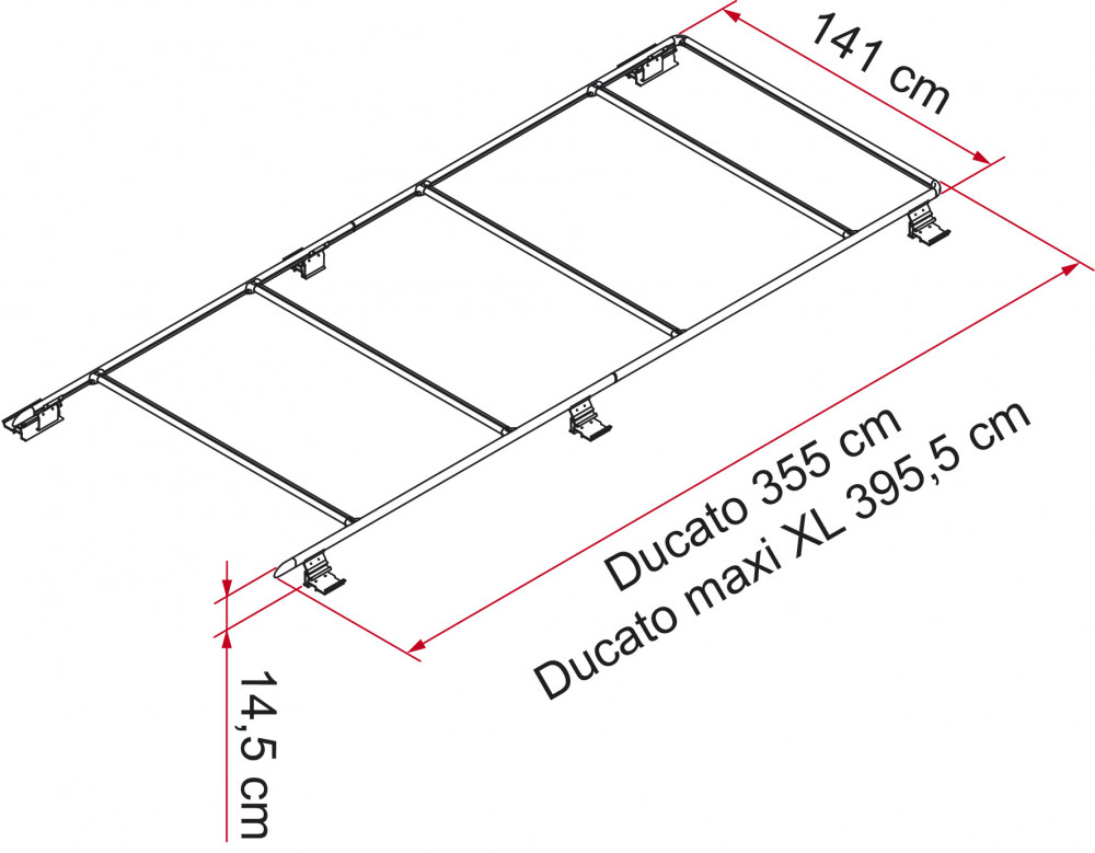 Dakdrager systeem speciaal ontworpen voor de Fiat Ducato na 06/2006 voor zowel lange als korte wielbasis. Eenvoudige montage zonder te hoeven boren in het dak van het voertuig dankzij het voorgemonteerde bevestigingssysteem op het dak van het voertuig. Maximale laadcapaciteit per rail: 100kg. Het is mogelijk om de dakluifel F65S te monteren, zowel links al rechts maar alleen op de verhoogde versie (H2) met behulp van de meegeleverde beugels.