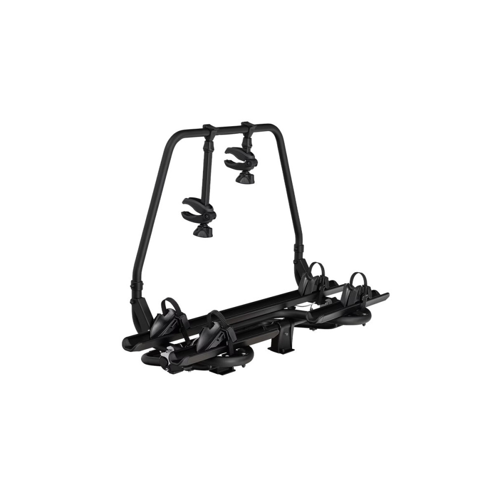De perfecte fietsendrager om 2 E-Bikes te vervoeren op de caravandissel. Geschikt voor normale en korte dissels. De fietsen zijn makkelijk te laden dankzij het verlaagde platform. Volledig kantelbaar met beladen fietsen om de opbergruimte te kunnen bereiken. Het verstelbare tilt-stopsysteem vergemakkelijkt de bediening en beschermt het voertuig. Voorzien van een handmatig vergrendelbaar platform; voorkomt dat de fietsen tijdens het rijden bewegen. Dankzij de Thule AcuTight koppelbegrenzer weet je wanneer je fietsen veilig vast staan.