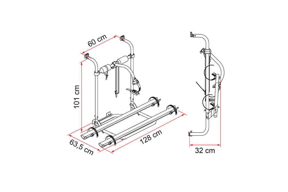 Deze fietsendrager is geschikt voor montage op de achterwand van een Hobby caravan geproduceerd na 2003. De speciale bovenbeugels dienen bevestigd te worden onder de rail van het achterraam. De onderbevestiging is gecentraliseerd.