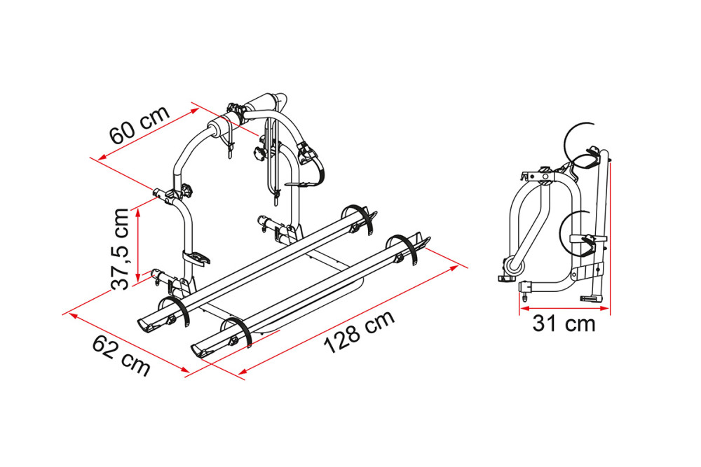 Fietsendrager met een vast ingesteld wandframe van 60cm breed. Geleverd zonder bevestigingsbeugels. Deze zijn al voorgemonteerd op enkel de CI en Roller Team campers.