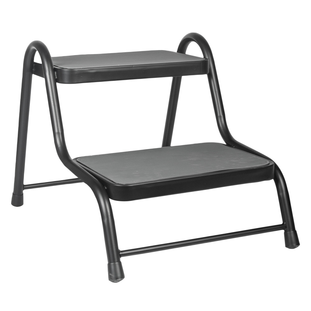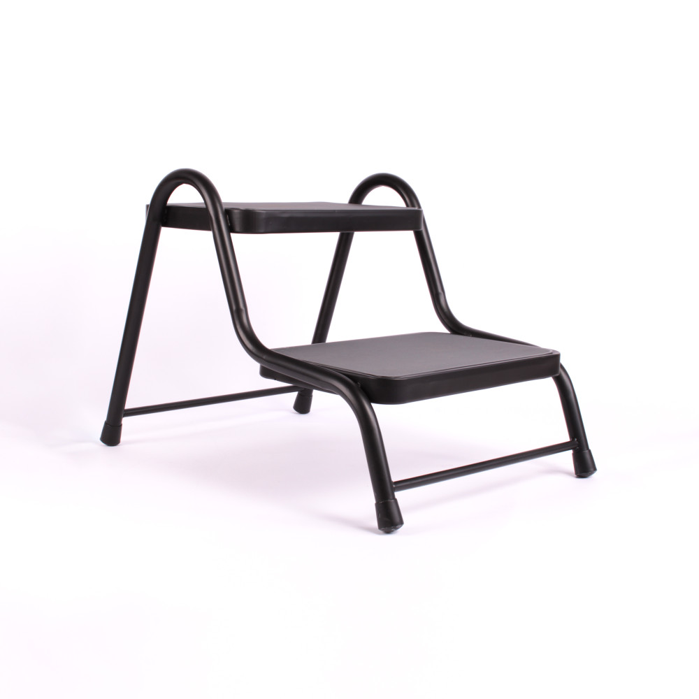 Dubbele opstap met sterk en stabiel zwart frame en grijs anti-slip rubber. Stapelbaar. Vergemakkelijkt het instappen van het voertuig. Plateau: 38x26cm Maten van de opstap: 43x63xH18/38/43cm