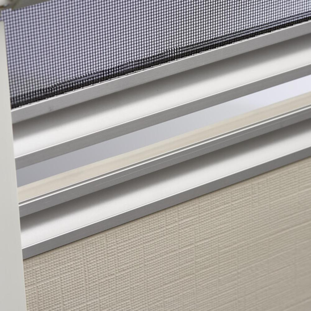 Het verduisteringsrolgordijn en de insectenhor kunnen afzonderlijk van elkaar worden versteld. De insectenhor kan boven of onder worden bevestigd. Voorgemonteerd voor eenvoudige montage op de meeste ramen. Geen zichtbare schroeven.