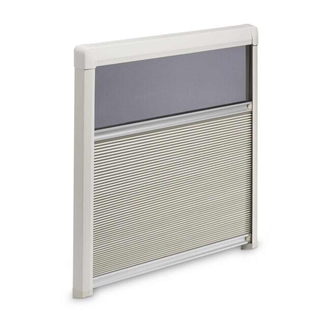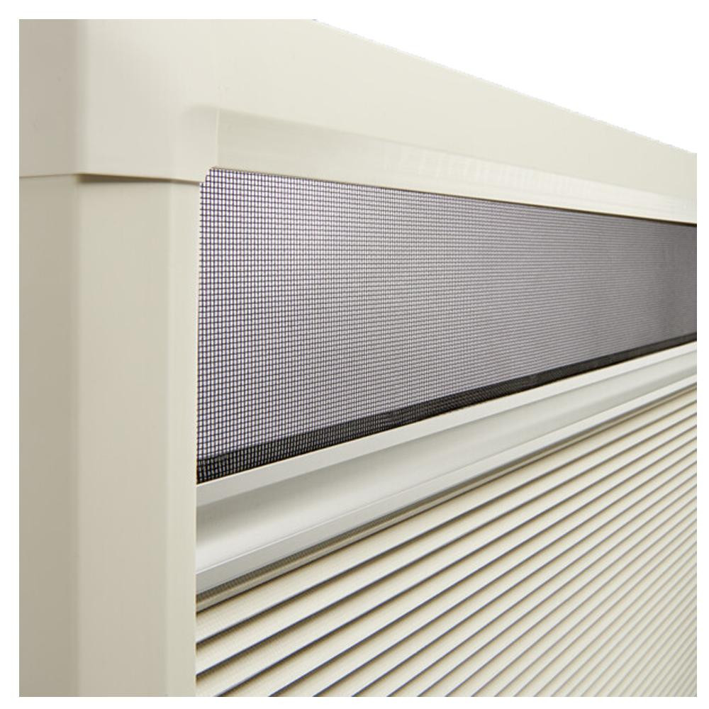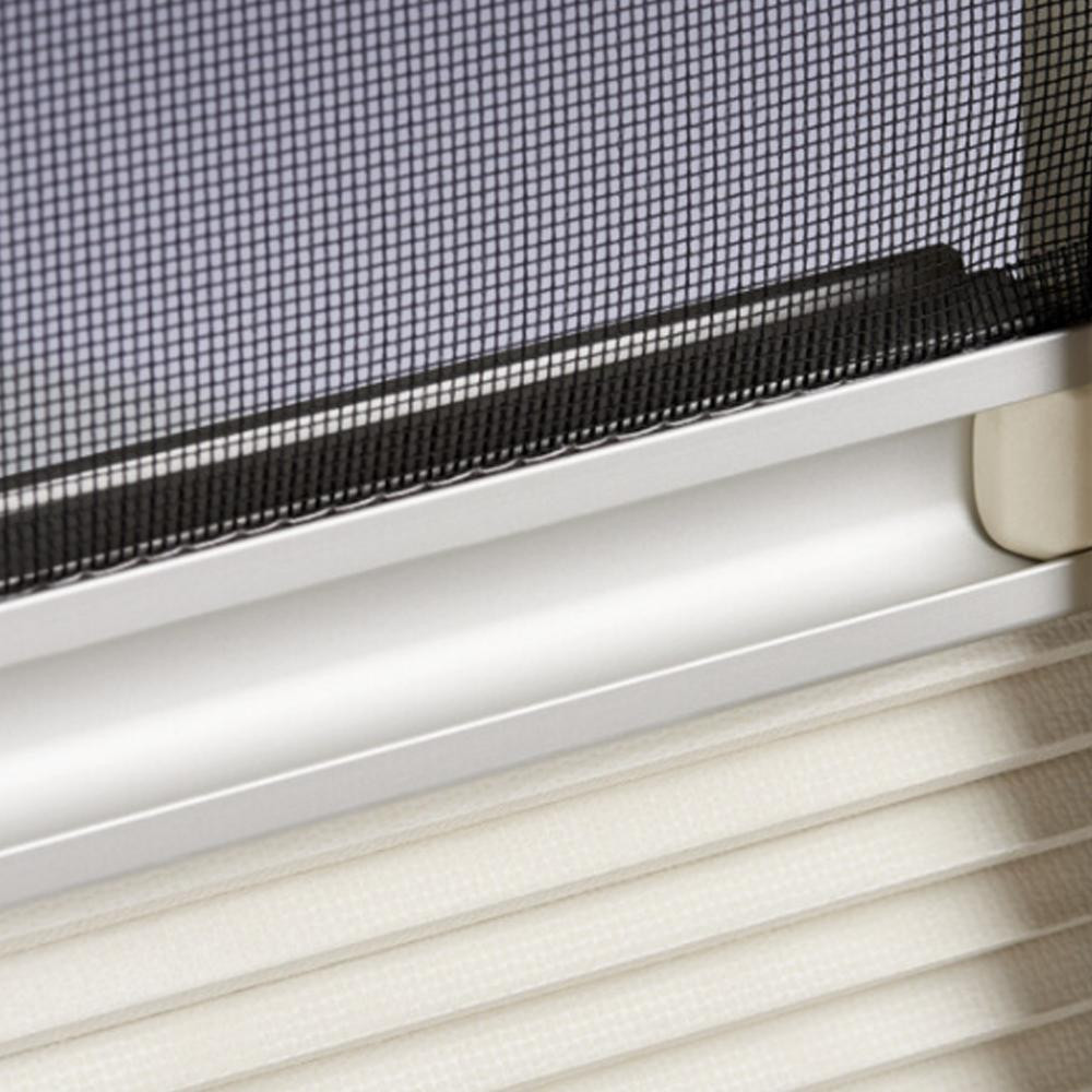 Het dubbel geplisseerde verduisteringsrolgordijn en de insectenhor kunnen afzonderlijk van elkaar worden versteld. Biedt een optimaal verduisteringseffect in combinatie met thermische isolatie. Voorgemonteerd voor montage op de meeste ramen, maar kan ook op maat gemaakt worden voor ramen met afwijkende afmetingen. Geen zichtbare schroeven.