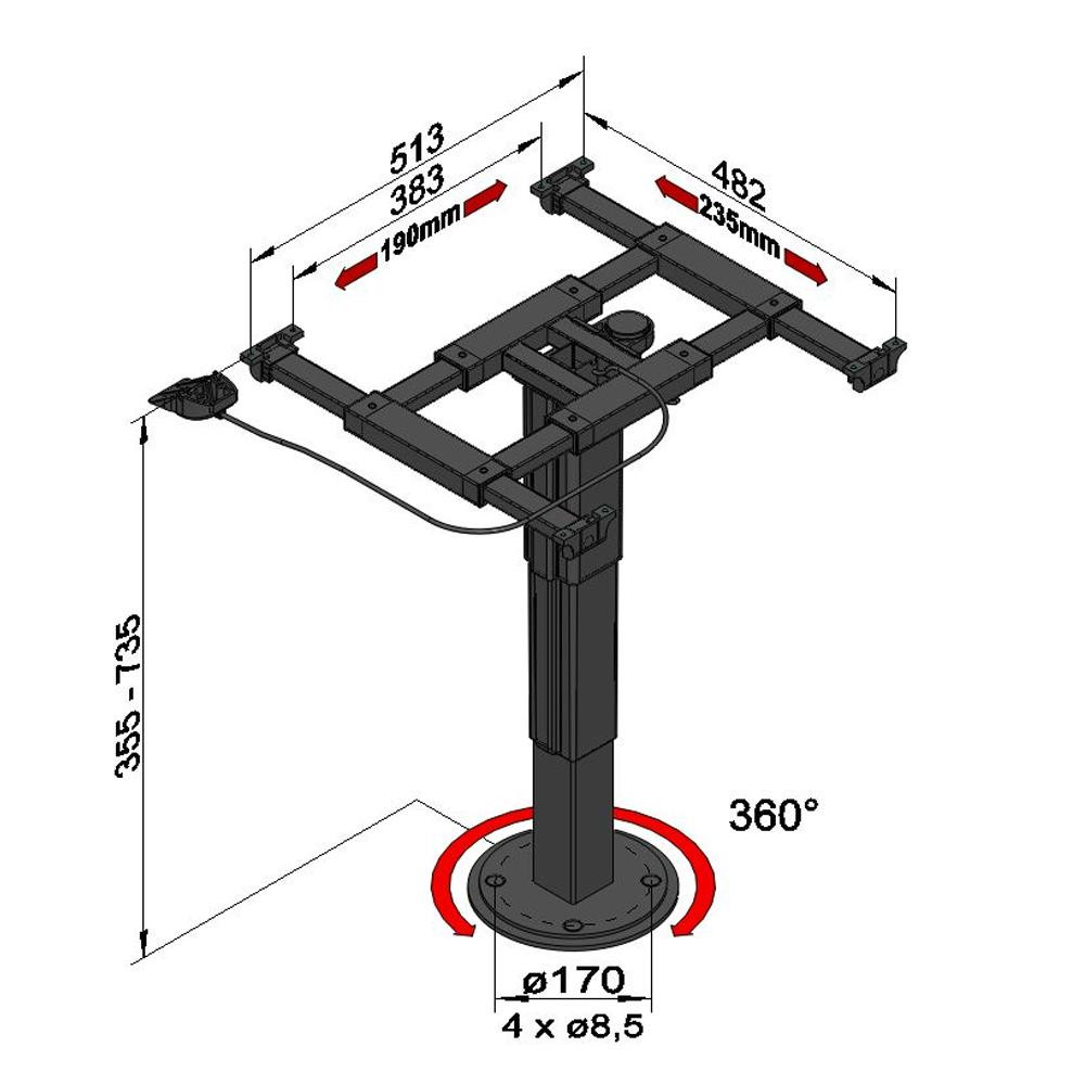 De Ilse tafelpoot 5986 A08 heeft en telescopische voet varierent in hoogte van 35.5 tot 73.5cm. Doormiddel van de handel is deze om hoog te zetten of te laten zakken. Het frame voor het tafelblad is verschuifbaar van links naar rechts.
