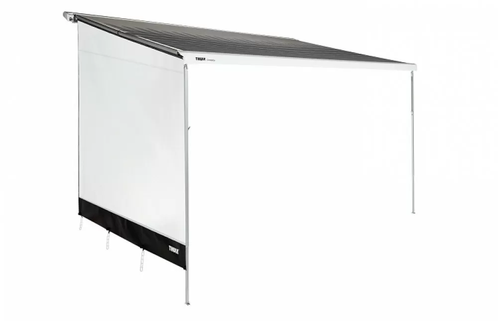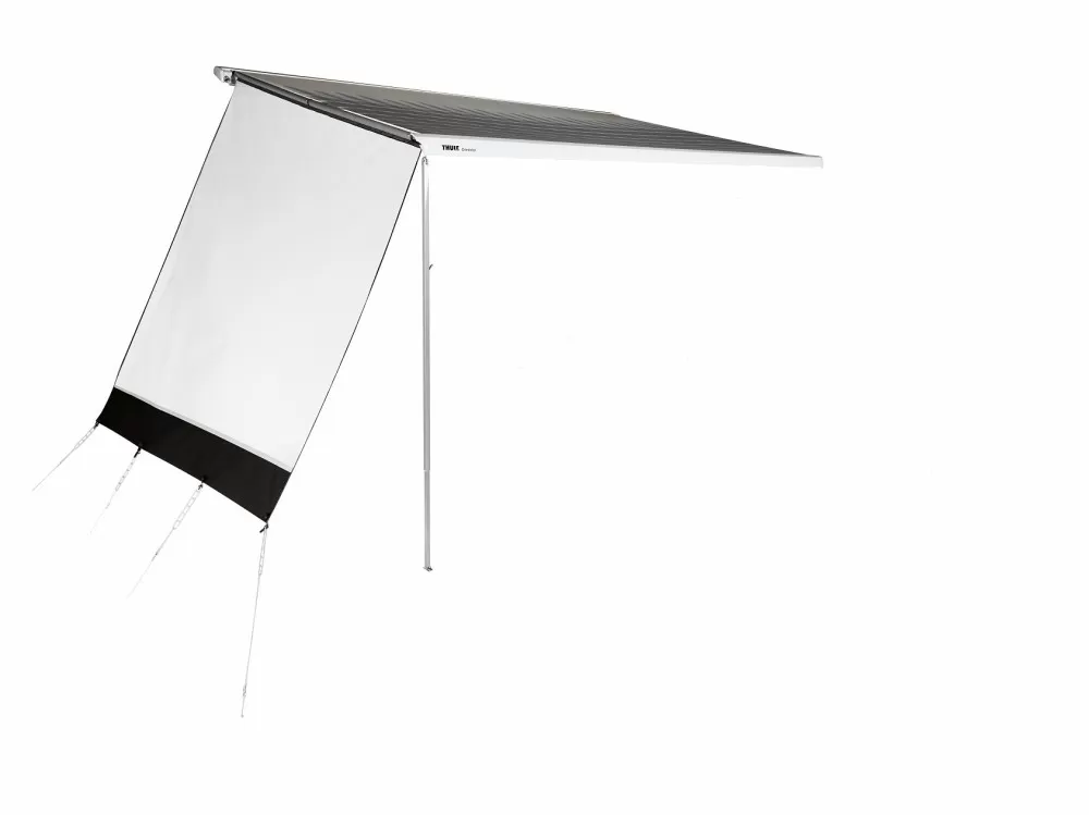Biedt bescherming tegen zon zonder het zicht te blokkeren. Gemakkelijk en snel te installeren; schuift in de aluminium spanstang die tussen de cassette en de voorlijst van de luifel aangebracht wordt. De zijwand kan met dezelfde spanstang aan beide zijden van de luifel aangebracht worden. Duurzaam, doorzichtig en luchtdoorlatend doek. Mogelijkheid om een paneel te combineren met een Thule QuickFit of EasyLink tent. Wordt geleverd met een aluminium spanstang met bevestigingsstukken geschikt voor beide zijden, haringen en scheerlijnen. Aanbouwhoogte: S: 1.90-2.24 S 3200: 1.90-2.24 M: 2.25-2.44 L: 2.45-2.64 1200: 2.25-2.49