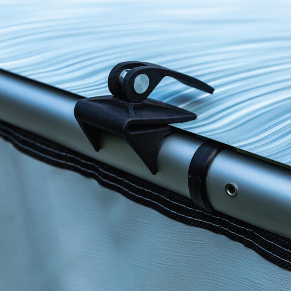 Set van twee klemmen om een slap hangend luifeldoek te vermijden. De klemmen zorgen voor een extra bevestiging tussen het luifeldoek en de spanstang. Gebruik tot twee klemmen aan één kant van de luifel. Makkelijke bevestiging; klik de klem vast op de stang, plaats het luifeldoek er tussen, aanspannen met de greep en de klem zit vast. Past op: - de ovale zijpaneelstang - de Thule Tension Rafter G2 - de vierkante telescopische spanstang voor de Thule 1200