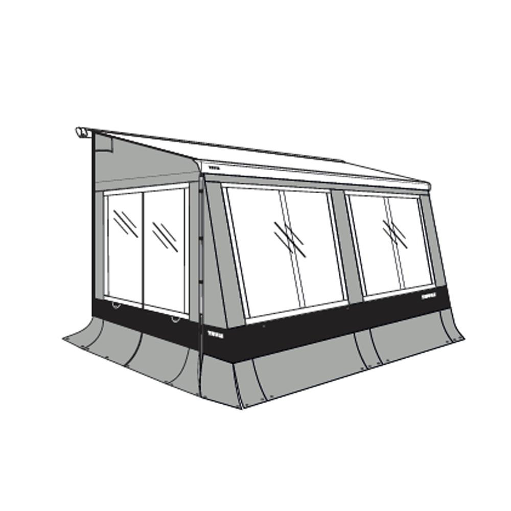 De Thule Veduta is een tent die te verkrijgen is in 4 lengtes 4 meter tot 5 meter en kan alleen gebruikt worden met de Thule 6300/ 6200 luifel met een montage hoogte van 2.45-2.59meter. De bijgeleverde klemprofielen verbinden de zijwanden met het luifeldoek en zorgt voor een perfecte aansluiting tussen wand en dak. De zijwanden worden in de opening van deklemprofielen geschoven en de voorwand schuift in de voorlijst van de luifel. De 4 vensterpanelen zijn uitritsbaar. Er is 1 paneel die zowel aan de zijkant als voorkant geplaatst kan worden waardoor je een deur kan maken op de gewenste plek. Alle ramen zijn voorzien van muggengaas om vuil en ongedierte buiten te houden en optimaal te kunnen ventileren. De onderzijde van de tent is voorzien van en dubbele tochtstrook voor een betere afscherming tegen vuil en regen.