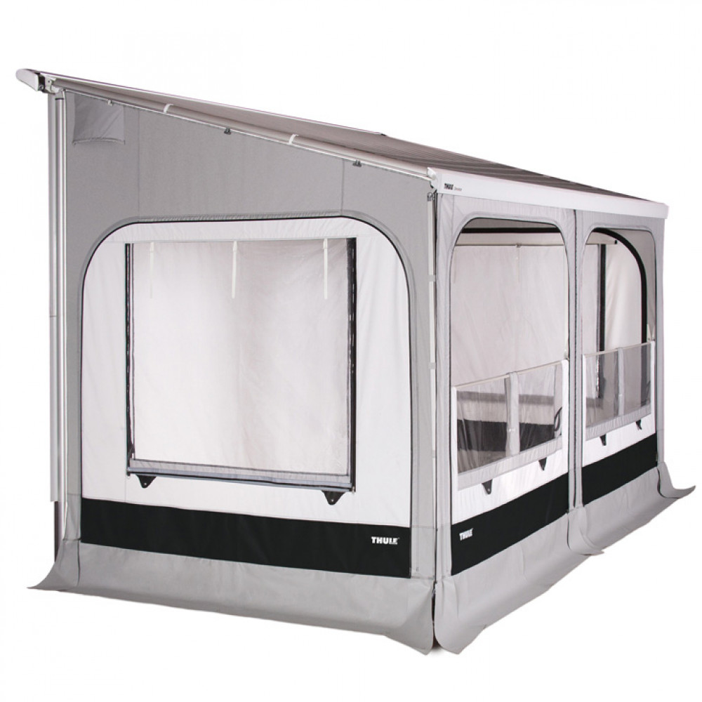 De Thule Panorama is een makkelijk te bevestigen complete luifeltent. De voorwand schuift in de voorlijst van de luifel en klemprofielen verbinden de zijwanden met het luifeldoek. Een ritssluiting zorgt voor een goede aansluiting tussen de voorwand en zijwanden. Deze zijn volledig te verwijderen, zijn verticaal te openen om ze als deur te gebruiken of horizontaal te openen in een veranda opstelling. Elk paneel heeft een geïntegreerde linker- en rechterdeur. De Panorama heeft aan beide zijden ventilatieopeningen die optimale luchtcirculatie mogelijk maken wanneer de tent dicht is. Bovendien zijn de zijramen voorzien van muggengaas. De tent is gemaakt van Airtex doek van 100% polyester en is aan één kant gecoat met acrylaat en geïmpregneerd met een afwerking op basis van Teflon. Het doek absorbeert nauwelijks vocht, is schimmelwerend, waterbestendig en afwasbaar.