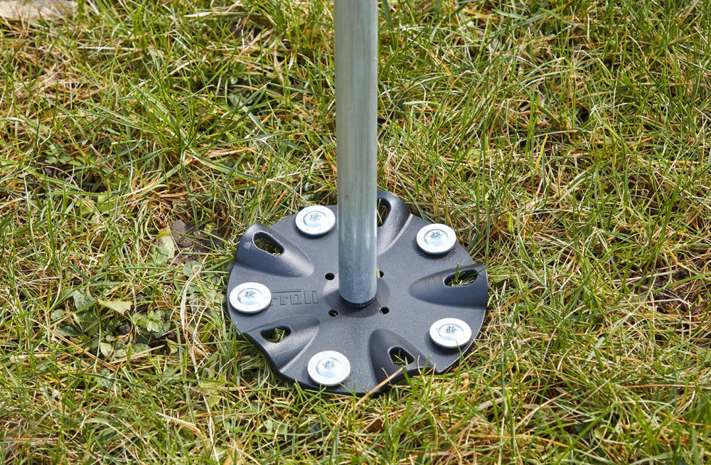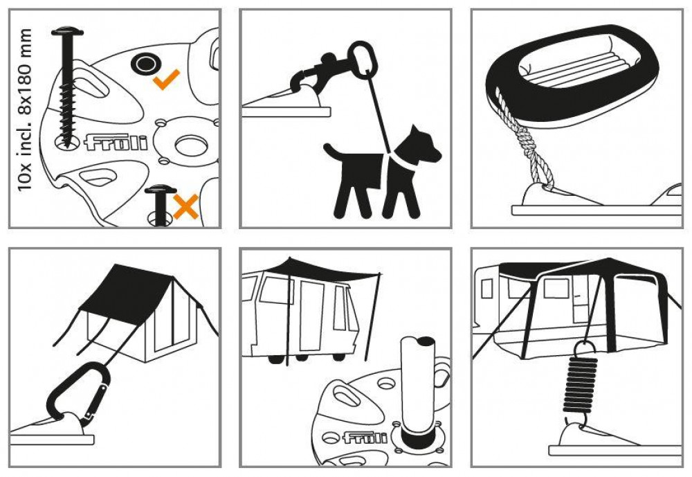 Met de ankerplaten worden (voor)tenten en luifels perfect vastgezet. Daarnaast heeft de ankerplaat extra ankerpunten voor het bevestigen van bijvoorbeeld de hondenriem of ander kampeergerei. Eenvoudig te bevestigen met de meegeleverde schroeven. Voordelen: - Het beveiligen van tenten, luifels en nog veel meer - Test belasting 200kg - Gemaakt van 100% gerecycled materiaal Set bevat: 2 ankerplaten en 10 bevestigingsschroeven (8x180mm)