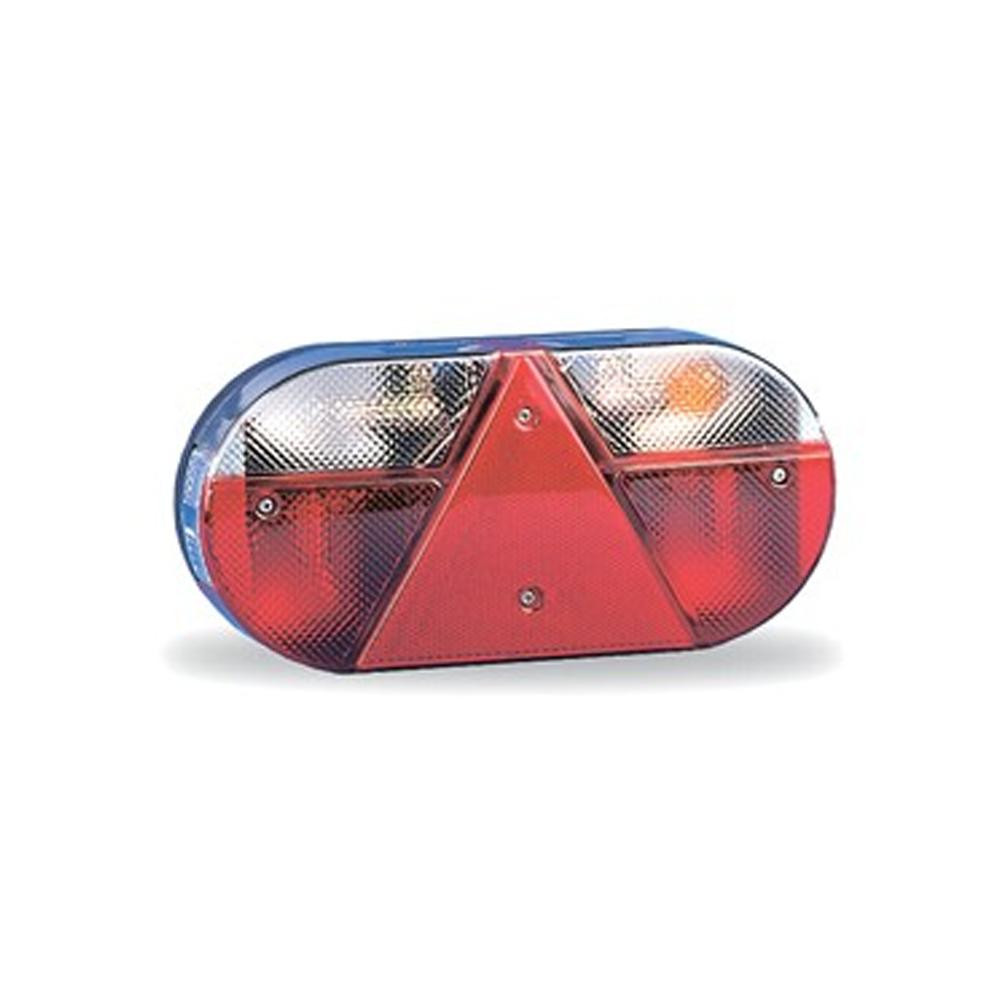 Opbouw achterlicht met remlicht, knipperlicht, kentekenverlichting, mistlicht, achteruitrijlicht en driehoek reflector. Met 6-polige aansluiting. Rechter uitvoering.